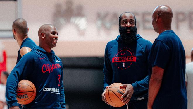 泪目!哈登保罗同框训练,快船首发确定4人:比尔受优待